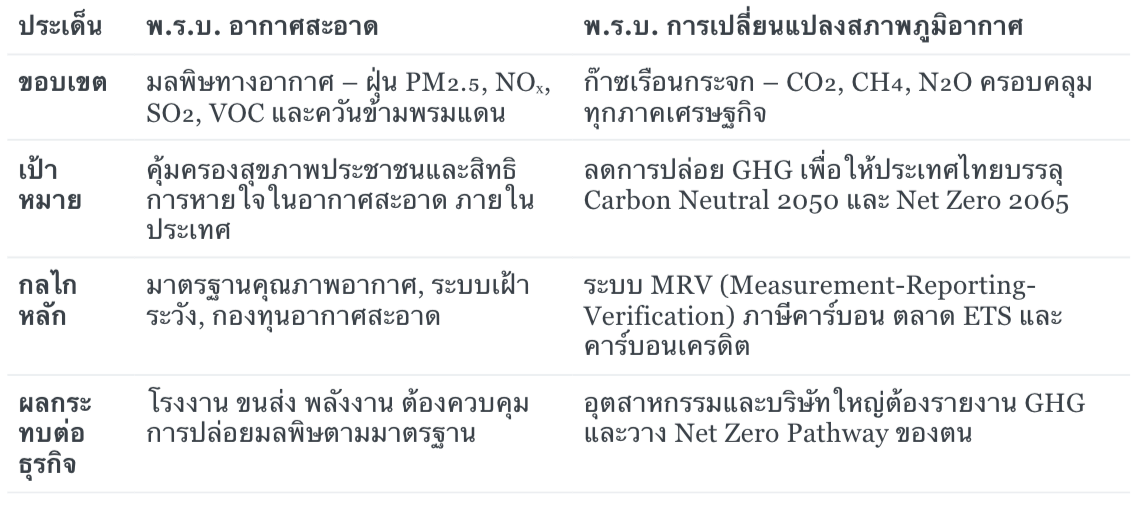 เมื่อพูดถึงกฎหมายสิ่งแวดล้อมของไทย หลายคนอาจสงสัยว่า “พ.ร.บ. อากาศสะอาด” กับ “พ.ร.บ. การเปลี่ยนแปลงสภาพภูมิอากาศ” เป็นกฎหมายเรื่องเดียวกันหรือไม่ แต่แท้จริงแล้ว ทั้งสองฉบับมุ่งแก้ปัญหาคนละระดับ แต่เชื่อมโยงกันในภาพรวมของนโยบาย Net Zero ประเทศไทย